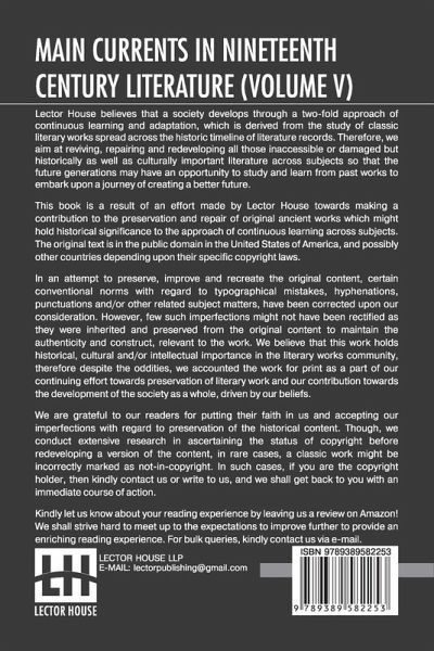 Main Currents In Nineteenth Century Literature (Volume V): V. - The Romantic School In France, Translated By Diana White And Mary Morison (In Six Volumes - Vol. V.) This book is a result of an effort made by us towards making a contribution to the preservation and repair of original classic literature. In an attempt to preserve, improve and recreate the original content, we have worked towards: 1. Type-setting & Reformatting: The complete work has been re-designed via professional layout, formatting and type-setting tools to re-create the same edition with rich typography, graphics, high quality images, and table elements, giving our readers the feel of holding a 'fresh and newly' reprinted and/or revised edition, as opposed to other scanned & printed (Optical Character Recognition - OCR) reproductions. 2. Correction of imperfections: As the work was re-created from the scratch, therefore, it was vetted to rectify certain conventional norms with regard to typographical mistakes, hyphenations, punctuations, blurred images, missing content/pages, and/or other related subject matters, upon our consideration. Every attempt was made to rectify the imperfections related to omitted constructs in the original edition via other references. However, a few of such imperfections which could not be rectified due to intentional\unintentional omission of content in the original edition, were inherited and preserved from the original work to maintain the authenticity and construct, relevant to the work. We believe that this work holds historical, cultural and/or intellectual importance in the literary works community, therefore despite the oddities, we accounted the work for print as a part of our continuing effort towards preservation of literary work and our contribution towards the development of the society as a whole, driven by our beliefs. We are grateful to our readers for putting their faith in us and accepting our imperfections with regard to preservation of the historical content. HAPPY READING!