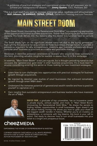 Xavier Egan, a graduate of top universities, has an impressive career in private equity, venture capital, and more. In "Main Street Boom: Uncovering the Generational Gold Mine," he shares the secrets to finding hidden opportunities in small businesses. Egan doesn't just talk about making money-he shows you how to grab your share of the biggest wealth transfer in history. Whether you're an investor, an entrepreneur, or someone with big dreams, this book is your call to action. Get ready to discover how to turn small businesses into your ticket to a bright and prosperous future.