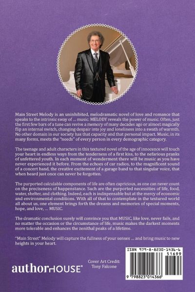 Main Street Melody is an uninhibited, melodramatic novel of love and romance that speaks to the intrinsic sway of ... music. MELODY reveals the power of music. Often, just the first few bars of a tune can revive a memory of many decades ago or almost magically flip an internal switch, changing despair into joy and loneliness into a swath of warmth. No other domain in our society has that capacity and that personal impact. Music, in its many forms, meets the "needs" of every person in every demographic category. The teenage and adult characters in this textured novel of the age of innocence will touch your heart in endless ways from the tenderness of a first kiss, to the nefarious pranks of unfettered youth. In each moment of wonderment there will be music as you have never experienced it before. From the echoes of car radios, to the magnificent sound of a concert band, the creative excitement of a garage band to that singular voice, that when heard just once can never be forgotten. The purported calculable components of life are often capricious, as one can never count on the preciseness of happenstance. Such are the purported necessities of life, food, water, shelter, and clothing. Indeed, each is indispensable but at the mercy of economic and environmental conditions. With all of that to contemplate in the textured world all about us, one element brings forth the dreams and memories of special moments, hope, and love, ... MUSIC. The dramatic conclusion surely will convince you that MUSIC, like love, never fails, and no matter the occasion or the circumstance of life, music makes the darkest moments more tolerable and enhances the zenithal peaks of a lifetime. "Main Street" Melody will capture the fullness of your senses ... and bring music to new heights in your heart.