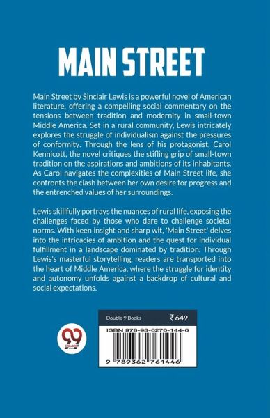 Main Street by Sinclair Lewis is a powerful novel of American literature, offering a compelling social commentary on the tensions between tradition and modernity in small-town Middle America. Set in a rural community, Lewis intricately explores the struggle of individualism against the pressures of conformity. Through the lens of his protagonist, Carol Kennicott, the novel critiques the stifling grip of small-town tradition on the aspirations and ambitions of its inhabitants. As Carol navigates the complexities of Main Street life, she confronts the clash between her own desire for progress and the entrenched values of her surroundings. Lewis skillfully portrays the nuances of rural life, exposing the challenges faced by those who dare to challenge societal norms. With keen insight and sharp wit, 'Main Street' delves into the intricacies of ambition and the quest for individual fulfillment in a landscape dominated by tradition. Through Lewis's masterful storytelling, readers are transported into the heart of Middle America, where the struggle for identity and autonomy unfolds against a backdrop of cultural and social expectations."