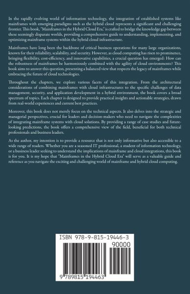 In the rapidly evolving world of information technology, the integration of established systems like mainframes with emerging paradigms such as the hybrid cloud represents a significant and challenging frontier. This book, "Mainframes in the Hybrid Cloud Era," is crafted to bridge the knowledge gap between these seemingly disparate worlds, providing a comprehensive guide to understanding, implementing, and optimizing mainframe systems within the hybrid cloud infrastructure. Mainframes have long been the backbone of critical business operations for many large organizations, known for their reliability, scalability, and security. However, as cloud computing has risen to prominence, bringing flexibility, cost-efficiency, and innovative capabilities, a crucial question has emerged: How can the robustness of mainframes be harmoniously combined with the agility of cloud environments? This book aims to answer this question, presenting a balanced view that respects the legacy of mainframes while embracing the future of cloud technologies. Throughout the chapters, we explore various facets of this integration. From the architectural considerations of combining mainframes with cloud infrastructures to the specific challenges of data management, security, and application development in a hybrid environment, the book covers a broad spectrum of topics. Each chapter is designed to provide practical insights and actionable strategies, drawn from real-world experiences and current best practices. Moreover, this book does not merely focus on the technical aspects. It also delves into the strategic and managerial perspectives, crucial for leaders and decision-makers who need to navigate the complexities of integrating mainframe systems with cloud solutions. By providing a range of case studies and future-looking predictions, the book offers a comprehensive view of the field, beneficial for both technical professionals and business leaders. As the author, my intention is to provide a resource that is not only informative but also accessible to a wide range of readers. Whether you are a seasoned IT professional, a student of information technology, or a business leader seeking to understand the implications of mainframe and cloud integrations, this book is for you. It is my hope that "Mainframes in the Hybrid Cloud Era" will serve as a valuable guide and reference as you navigate the exciting and challenging world of mainframe and hybrid cloud computing.