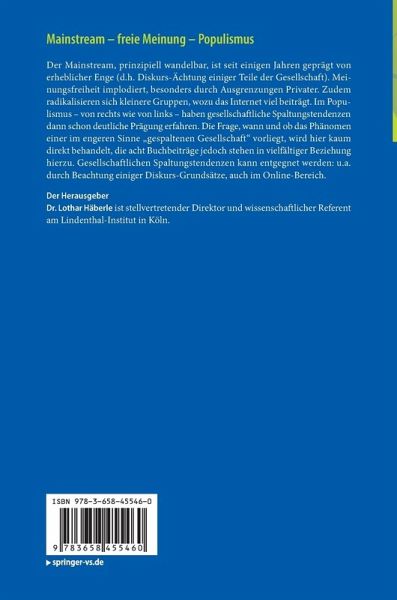 Der Mainstream, prinzipiell wandelbar, ist seit einigen Jahren geprägt von erheblicher Enge (d.h. Diskurs-Ächtung einiger Teile der Gesellschaft). Meinungsfreiheit implodiert, besonders durch Ausgrenzungen Privater. Zudem radikalisieren sich kleinere Gruppen, wozu das Internet viel beiträgt. Im Populismus - von rechts wie von links - haben gesellschaftliche Spaltungstendenzen dann schon deutliche Prägung erfahren. Die Frage, wann und ob das Phänomen einer im engeren Sinne "gespaltenen Gesellschaft" vorliegt, wird hier kaum direkt behandelt, die acht Buchbeiträge jedoch stehen in vielfältiger Beziehung hierzu. Gesellschaftlichen Spaltungstendenzen kann entgegnet werden: u.a. durch Beachtung einiger Diskurs-Grundsätze, auch im Online-Bereich.
