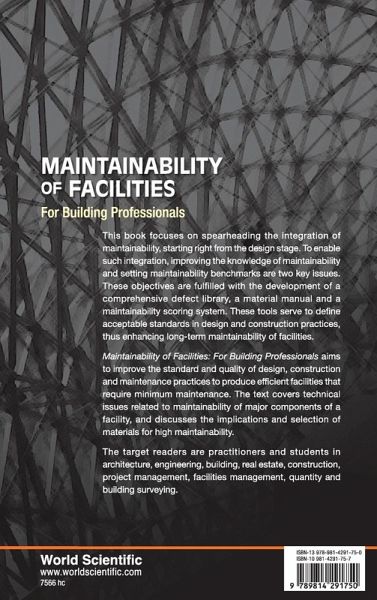 This book focuses on spearheading the integration of maintainability, starting right from the design stage. To enable such integration, improving the knowledge of maintainability and setting maintainability benchmarks are two key issues. These objectives are fulfilled with the development of a comprehensive defect library, a material manual and a maintainability scoring system. These tools serve to define acceptable standards in design and construction practices, thus enhancing long-term maintainability of facilities. Maintainability of Facilities: For Building Professionals aims to improve the standard and quality of design, construction and maintenance practices to produce efficient facilities that require minimum maintenance. The text covers technical issues related to maintainability of major components of a facility, and discusses the implications and selection of materials for high maintainability. The target readers are practitioners and students in architecture, engineering, building, real estate, construction, project management, facilities management, quantity and building surveying.