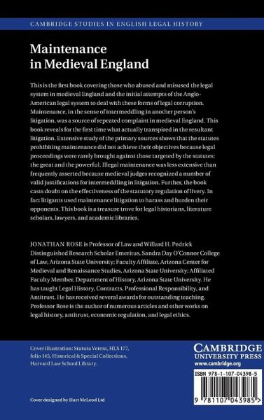 This is the first book covering those who abused and misused the legal system in medieval England and the initial attempts of the Anglo-American legal system to deal with these forms of legal corruption. Maintenance, in the sense of intermeddling in another person's litigation, was a source of repeated complaint in medieval England. This book reveals for the first time what actually transpired in the resultant litigation. Extensive study of the primary sources shows that the statutes prohibiting maintenance did not achieve their objectives because legal proceedings were rarely brought against those targeted by the statutes: the great and the powerful. Illegal maintenance was less extensive than frequently asserted because medieval judges recognized a number of valid justifications for intermeddling in litigation. Further, the book casts doubt on the effectiveness of the statutory regulation of livery. This is a treasure trove for legal historians, literature scholars, lawyers, and academic libraries.