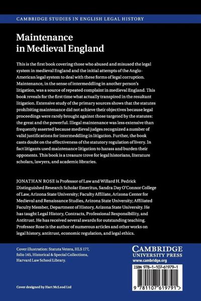 1. Introduction 2. Social norms relating to the assistance of others 3. Legal responses to the corruption of justice 4. The early litigation 1272-1327 5. Efforts to deal with corruption of justice in the reign of Edward III 6. Criminal and civil litigation during the reign of Edward III 7. Maintenance and medieval literature 8. Changes in the late medieval period 9. The development of the law of maintenance: permissible justifications for meddling 10. The development of the law of maintenance: illegal maintenance 11. Livery 12. Achieving the legislative objectives of the maintenance statutes 13. Conclusion.