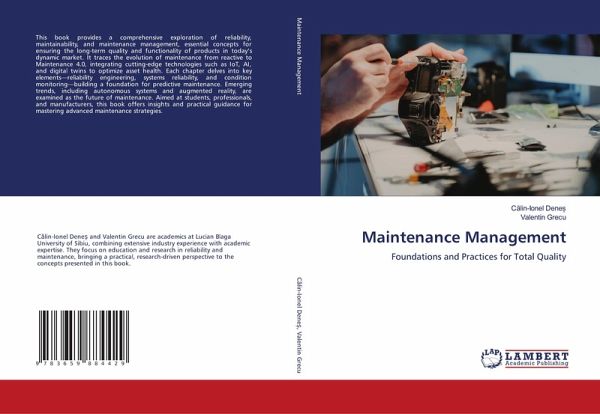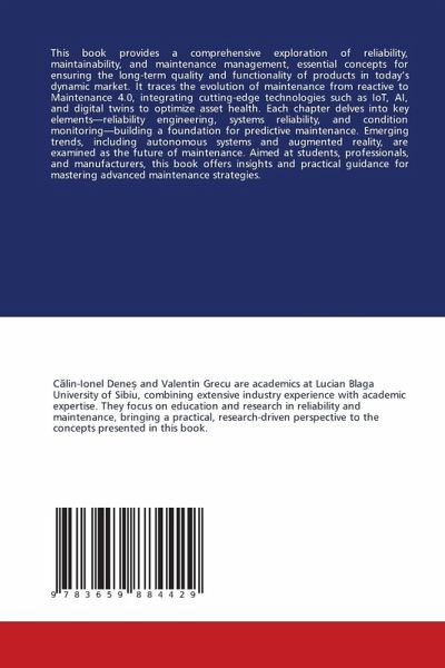 This book provides a comprehensive exploration of reliability, maintainability, and maintenance management, essential concepts for ensuring the long-term quality and functionality of products in today's dynamic market. It traces the evolution of maintenance from reactive to Maintenance 4.0, integrating cutting-edge technologies such as IoT, AI, and digital twins to optimize asset health. Each chapter delves into key elements-reliability engineering, systems reliability, and condition monitoring-building a foundation for predictive maintenance. Emerging trends, including autonomous systems and augmented reality, are examined as the future of maintenance. Aimed at students, professionals, and manufacturers, this book offers insights and practical guidance for mastering advanced maintenance strategies.
