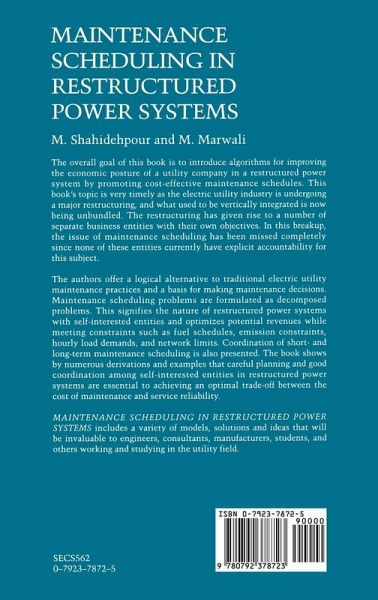 The overall goal of this book is to introduce algorithms for improving the economic posture of a utility company in a restructured power system by promoting cost-effective maintenance schedules. Today, cutting operations and maintenance (O&M) costs and preserving service reliability) are among the top priorities for managers ofutility companies. Preventive maintenance is perhaps the single largest controllable cost ofa utility2 operation. It is perceived that a careful planning and a good coordination among self-interested entities in a restructured power system are essential to achieving an optimal trade-off between the cost ofmaintenance and the service reliability. Traditional maintenance programs in verticall/ integrated utilities relied heavily on time-directed maintenance and manufacturer recommendations. This book offers a logical alternative to traditional electric utility maintenance practices and a basis for maintenance decisions. The book is organized as follows. Chapter I reviews various issues related to the power system operation and presents the role of restructuring in maintenance scheduling. In Chapter II, fundamental topics related to linear and nonlinear systems are reviewed. The duality in linear programming is discussed and integer programming is reviewed. Benders decomposition, Lagrangian relaxation, and Dantzig-Wolfe decomposition are presented. Several examples are given to demonstrate the applications ofdifferent methods. The formulation ofreactive power optimization is discussed which will be used again in Chapter VII.