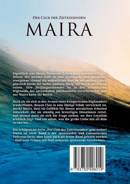 Eigentlich war Maira Thomsons Leben ganz beschaulich - sie führte ihr kleines Café in den Highlands und versuchte, wenigstens einmal ein ordentliches Date zu bekommen - doch plötzlich bleibt ihr nichts anderes übrig, als durch die Zeit zu reisen. Ihre Zwillingsschwester ist in den schottischen Highlands des sechzehnten Jahrhunderts verschwunden und nur Maira kann ihr helfen.Doch als sie sich in den Armen eines kriegerischen Highlanders wiederfindet, dessen Clan in eine blutige Fehde verwickelt ist, merkt Maira, dass sie Gefühle für diesen attraktiven Schotten entwickelt, der sie ständig aus brenzligen Situationen rettet. Auf einmal muss sie sich die Frage stellen, wo ihre Loyalität wirklich liegt. Und vor allem, was die große Liebe mit all dem zu tun hat ... Es braucht ganz besondere Menschen, um ihr zu helfen, diese Abenteuer durchzustehen. Am besten welche, die Erfahrung mit Zeitreisen haben. Und so trifft sie auf Jenna und Evan und erfährt, dass es sogar einen Club der Zeitreisenden gibt. Die erfolgreiche Serie Der Club der Zeitreisenden geht weiter! Maira ist zwar Band 5 der spannenden und romantischen Zeitreise-Serie, aber kann auch als erster Band gelesen werden - vier neue Frauen mit vier weiteren, spannende GeschichtenDu wirst dieses romantische Zeitreise-Abenteuer lieben, denn wer kann schon einer Geschichte widerstehen, die vom Ruf der Liebe des Lebens erzählt?Alle Romane von Der Club der Zeitreisenden sind in sich abgeschlossen und in jedem Buch findet eine der Freundinnen, den Mann, für den sie bestimmt ist. Begleite die Frauen in eine Welt voller Abenteuer, Freundschaft, Liebe und natürlich atemberaubender Highlander im schottischen Hochland.