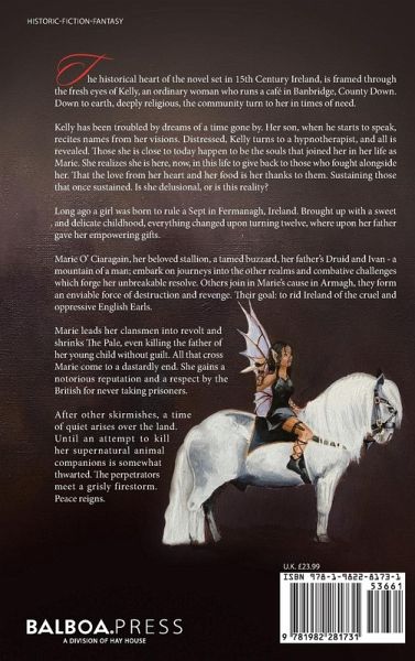 The historical heart of the novel set in 15th Century Ireland, is framed through the fresh eyes of Kelly, an ordinary woman who runs a café in Banbridge, County Down. Down to earth, deeply religious, the community turn to her in times of need. Kelly has been troubled by dreams of a time gone by. Her son, when he starts to speak, recites names from her visions. Distressed, Kelly turns to a hypnotherapist, and all is revealed. Those she is close to today happen to be the souls that joined her in her life as Maire. She realizes she is here, now, in this life to give back to those who fought alongside her. That the love from her heart and her food is her thanks to them. Sustaining those that once sustained her. Is she delusional, or is this reality? Long ago a girl was born to rule a Sept in Fermanagh, Ireland. Brought up with a sweet and delicate childhood, everything changed upon turning twelve, where upon her father gave her empowering gifts. Maire O' Ciaragain her beloved stallion, a tamed buzzard, her father's Druid and Ivan- a mountain of a man; embark on journeys into the other realms and combative challenges which forge her unbreakable resolve. Others join in Maire's cause in Armagh, they form an enviable force of destruction and revenge. Their goal: to rid Ireland of the cruel and oppressive English Earls. Maire leads her clansmen into revolt and shrinks The Pale, even killing the father of her young child without guilt. All that cross Maire come to a dastardly end. She gains a notorious reputation and a respect by the British for never taking prisoners. After other skirmishes, a time of quiet arises over the land. Until an attempt to kill her supernatural animal companions is somewhat thwarted. The perpetrators meet a grisly firestorm. Peace reigns.