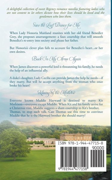 A delightful collection of sweet Regency romance novellas featuring ladies who are not content to let others dictate how their lives should be lived and the gentlemen who love them. Save the Last Dance for Me When Lady Honoria Maitland reunites with her old friend Benedict Grey, she proposes an arrangement: a faux courtship that will smooth Benedict's re-entry into society and please her father. But Honoria's clever plan fails to account for Benedict's heart...or her own desires. Back In My Arms Again When James discovers a powerful lord is threatening his family, he needs the help of an influential ally. A duke's daughter, Lady Cecilia can provide James the help he needs—if they marry. But will he accept anything from the woman who once broke his heart? Kissing by the Mistletoe Everyone knows Maddie Hayward is destined to marry Kit Mathison—everyone except Maddie. When Kit and his family arrive for a Christmas visit, Maddie suggests a sham courtship to Kit's brother, Thomas, to stop such talk. Can Thomas use this time to convince Maddie that he is the Mathison brother she should marry?