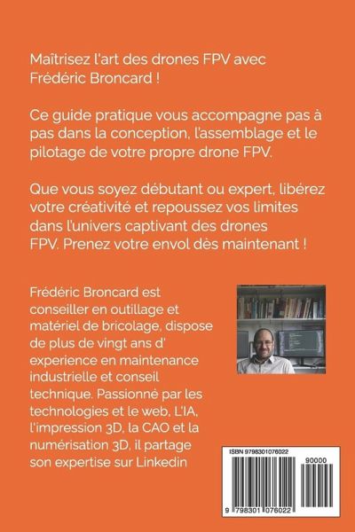 Plongez dans l'univers fascinant des drones FPV. Apprenez à concevoir, assembler et maîtriser votre propre drone grâce à des explications accessibles et détaillées. Que vous soyez novice ou passionné expérimenté, découvrez comment choisir les composants idéaux, affiner les réglages pour des performances optimales, et développer vos compétences de pilotage à l'aide de simulateurs. Ce livre explore également les innovations récentes, comme l'impression 3D et les accessoires personnalisés, pour faire de chaque vol une expérience unique. Une ressource incontournable pour repousser vos limites et libérer votre créativité dans le monde du FPV.