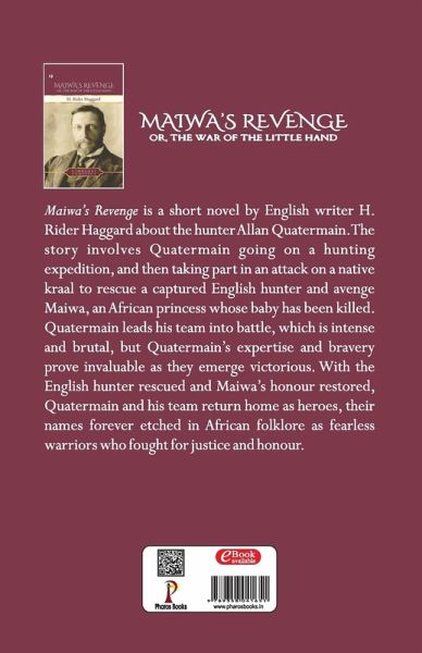 Maiwa's Revenge is a short novel by English writer H. Rider Haggard about the hunter Allan Quatermain. The story involves Quatermain going on a hunting expedition, and then taking part in an attack on a native kraal to rescue a captured English hunter and avenge Maiwa, an African princess whose baby has been killed. Quatermain leads his team into battle, which is intense and brutal, but Quatermain's expertise and bravery prove invaluable as they emerge victorious. With the English hunter rescued and Maiwa's honour restored, Quatermain and his team return home as heroes, their names forever etched in African folklore as fearless warriors who fought for justice and honour.
