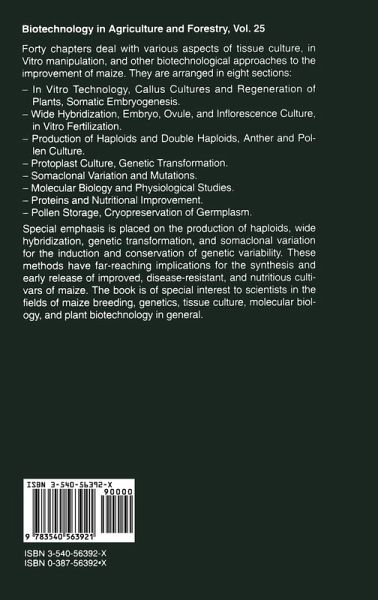 Forty chapters deal with various aspects of tissue culture, in vitro manipulation, and other biotechnological approaches to the improvement of maize. They are arranged in eight sections: - In Vitro Technology, Callus Cultures and Regeneration of Plants, Somatic Embryogenesis. - Wide Hybridization, Embryo, Ovule, and Inflorescence Culture, in Vitro Fertilization. - Production of Haploids and Double Haploids, Anther and Pollen Culture. - Protoplast Culture, Genetic Transformation. - Somaclonal Variation and Mutations. - Molecular Biology and Physiological Studies. - Proteins and Nutritional Improvement. Pollen Storage, Cryopreservation of Germplasm.…mehr