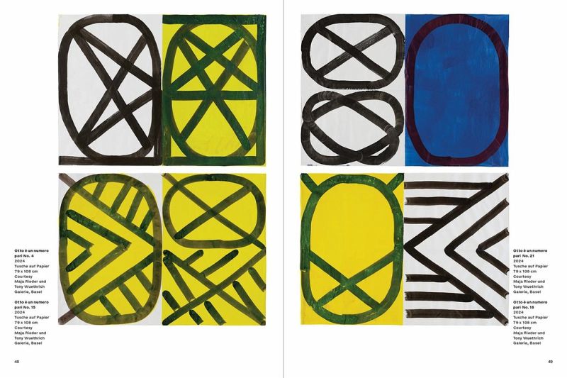Das Buch MMXXIV Maja Rieder zeigt Abbildungen der beiden neuen Werkblöcke Otto è un numero pari und Synthesizer (beide 2024). Zudem gibt es Einblicke in Entwurfs- und Skizzenmaterial welche den Arbeitsprozess der Künstlerin veranschaulichen.Über die Arbeiten der letzten vier Jahre informiert der Index im hinteren Teil des Buches.Das Bildmaterial wird durch zwei Texte (Deut. / Engl.) ergänzt, einen Essay von Anita Haldemann, Leiterin Kupferstichkabinett Basel und ein Gespräch zwischen der Künstlerin und Linda Schädler, Leiterin der graphischen Sammlung der ETH Zürich.Das Prozesshafte ist mir sehr wichtig. Ich zeichne, wie Du sagst, im Normalfall am Boden, wobei ich nicht nur an einem Blatt, sondern parallel an vielen Blättern arbeite. Das heisst, dass ich einige Striche auf ein Werk setze, zum nächsten gehe und dort weiterarbeite und so weiter, bis ich wieder beim ersten ankomme und dort weiterzeichne. Ich führe also gleichzeitig mehrere Werke aus. So können die verschiedenen Schichten trocknen. Doch eigentlich geht es mir vor allem darum, nicht vorab gedanklich alles durchdacht oder gar bis ins Detail konstruiert zu haben. Ich suche das Absichtslose. Daher kommt mir dieser rasche Prozess sehr entgegen. (Aus dem Gespräch zwischen Maja Rieder und Linda Schädler).