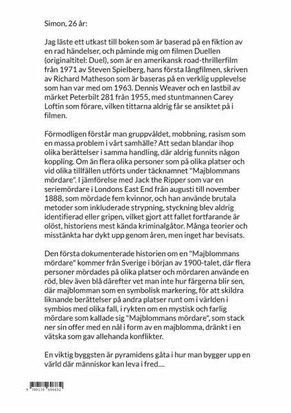 Simon, 26 år: Jag läste ett utkast till boken som är baserad på en fiktion av en rad händelser, och påminde mig om filmen Duellen (originaltitel: Duel), som är en amerikansk road-thrillerfilm från 1971 av Steven Spielberg, hans första långfilmen, skriven av Richard Matheson som är baseras på en verklig upplevelse som han var med om 1963. Dennis Weaver och en lastbil av märket Peterbilt 281 från 1955, med stuntmannen Carey Loftin som förare, vilken tittarna aldrig får se ansiktet på i filmen. Förmodligen förstår man gruppvåldet, mobbning, rasism som en massa problem i vårt samhälle? Att sedan blandar ihop olika berättelser i samma handling, där aldrig funnits någon koppling. Om än flera olika personer som på olika platser och vid olika tillfällen utförts under täcknamnet "Majblommans mördare". I jämförelse med Jack the Ripper som var en seriemördare i Londons East End från augusti till november 1888, som mördade fem kvinnor, och han använde brutala metoder som inkluderade strypning, styckning blev aldrig identifierad eller gripen, vilket gjort att fallet fortfarande är olöst, historiens mest kända kriminalgåtor. Många teorier och misstänkta har dykt upp genom åren, men inget har bevisats. Den första dokumenterade historien om en "Majblommans mördare" kommer från Sverige i början av 1900-talet, där flera personer mördades på olika platser och mördaren använde en röd, blev även blå därefter vet man inte hur färgerna blir sen, där majblomman som en symbolisk markering, för att skildra liknande berättelser på andra platser runt om i världen i symbios med olika fall, i rykten om en mystisk och farlig mördare som kallade sig "Majblommans mördare", som stack ner sin offer med en nål i form av en majblomma, dränkt i en vätska som gav allehanda konflikter. En viktig byggsten är pyramidens gåta i hur man bygger upp en värld där människor kan leva i fred....