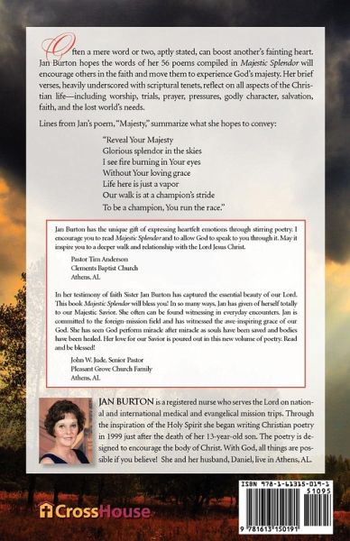 Often a mere word or two, aptly stated, can boost another's fainting heart. Jan Burton hopes the words of her 56 poems compiled in Majestic Splendor will encourage others in the faith and move them to experience God's majesty. Her brief verses, heavily underscored with scriptural tenets, reflect on all aspects of the Christian life-including worship, trials, prayer, pressures, godly character, salvation, faith, and the lost world's needs. Lines from Jan's poem, "Majesty", summarize what she hopes to convey: "Reveal Your Majesty Glorious splendor in the skies I see fire burning in Your eyes Without Your loving grace Life here is just a vapor Our walk is at a champion's stride To be a champion, You run the race."