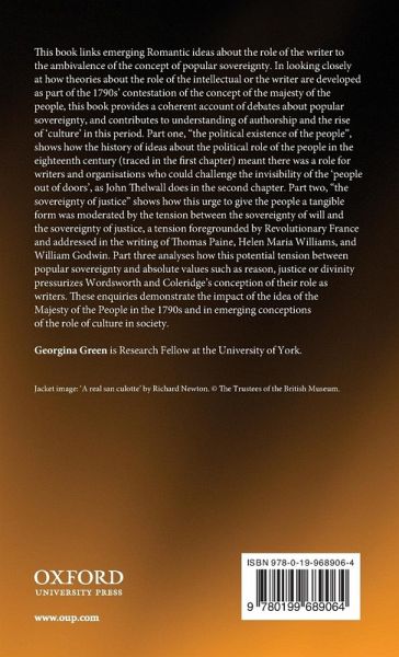The Majesty of the People links emerging Romantic ideas about the role of the writer to the ambivalence of the concept of popular sovereignty. By closely examining how theories about the role of the intellectual or the writer are developed as part of the 1790s' contestation of the concept of the majesty of the people, Georgina Green provides a coherent account of debates about popular sovereignty, and contributes to understanding of authorship and the rise of 'culture' in this period. Part one, 'the political existence of the people', shows how the history of ideas about the political role of the people in the eighteenth century meant there was a role for writers and organisations who could challenge the invisibility of the 'people out of doors'. Part two, 'the sovereignty of justice' shows how this urge to give the people a tangible form was moderated by the tension between the sovereignty of will and the sovereignty of justice, a tension foregrounded by Revolutionary France and addressed in the writing of Thomas Paine, Helen Maria Williams, and William Godwin. Part three analyses how this potential tension between popular sovereignty and absolute values such as reason, justice or divinity pressurizes Wordsworth and Coleridge's conception of their role as writers. These enquiries demonstrate the impact of the idea of the Majesty of the People in the 1790s and in emerging conceptions of the role of culture in society.