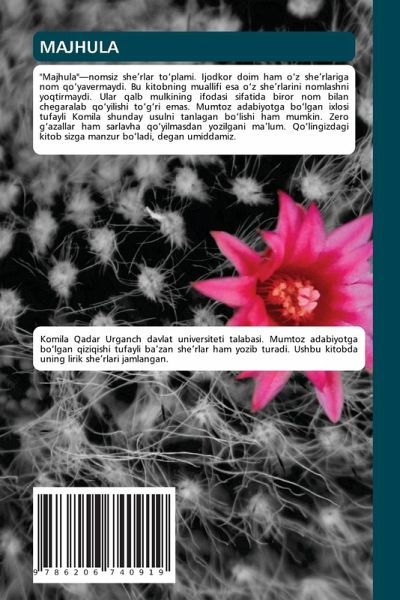 "Majhula"-nomsiz she¿rlar to¿plami. Ijodkor doim ham o¿z she¿rlariga nom qo¿yavermaydi. Bu kitobning muallifi esa o¿z she¿rlarini nomlashni yoqtirmaydi. Ular qalb mulkining ifodasi sifatida biror nom bilan chegaralab qo¿yilishi to¿g¿ri emas. Mumtoz adabiyotga bo¿lgan ixlosi tufayli Komila shunday usulni tanlagan bo¿lishi ham mumkin. Zero g¿azallar ham sarlavha qo¿yilmasdan yozilgani mälum. Qo¿lingizdagi kitob sizga manzur bo¿ladi, degan umiddamiz.