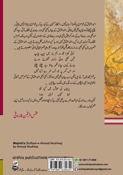 One of the leading and reputed Pakistani poets known for his neo-classical tone, equally well-known in India, lives in Houston USA. Shamsur Rahman Farooqui the great late critic literature praising Ahmad Mushtaq, Quote, "that in his poetry one can see a glimpse on Meer Taqi Meer and great Ghalib. This is a complete work of Ahmed Mushtaq.