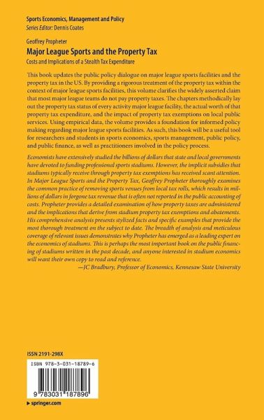 Economists have extensively studied the billions of dollars that state and local governments have devoted to funding professional sports stadiums. However, the implicit subsidies that stadiums typically receive through property tax exemptions has received scant attention. In Major League Sports and the Property Tax, Geoffrey Propheter thoroughly examines the common practice of removing sports venues from local tax rolls, which results in millions of dollars in forgone tax revenue that is often not reported in the public accounting of costs. Propheter provides a detailed examination of how property taxes are administered and the implications that derive from stadium property tax exemptions and abatements. His comprehensive analysis presents stylized facts and specific examples that provide the most thorough treatment on the subject to date. The breadth of analysis and meticulous coverage of relevant issues demonstrates why Propheter has emerged as a leading expert on the economics of stadiums. This is perhaps the most important book on the public financing of stadiums written in the past decade, and anyone interested in stadium economics will want their own copy to read and reference.