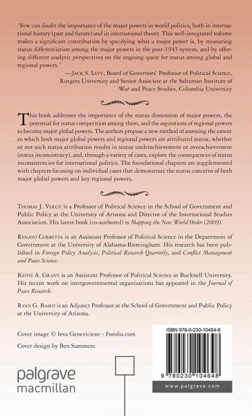 PART I: Major Global Powers and Their Status Major Power Status Attribution: Conceptual and Methodological Issues; T.J.Volgy , R.Corbetta , K.Grant , & R.Baird Global Leader, Global Power, Status Consistent Power: The United States; W.R.Thompson From Underachiever to Overachiever, and Where to Now: Russia as a Major Power; M.R.Freire From Regional Player to Overachieving Major Power: China; Y.Deng The Ups and Downs of Major Power Status: France; B.Badie PART II: Regional Powers, Status, and Aspirations for the Global Stage Regional Powers and Their Status: Further Conceptual and Methodological Issues; T.J.Volgy , R.Corbetta , K.Grant , & R.Baird South American Regional Order: the Growth of Brazil as a Regional Power; M.Herz Regional Power Development in a Space Thick with Competing Powers: India; R.Bashrur Regional Power Development in High Conflict Geopolitical Space: Iran and its Competitors Developing Regional Power Capacity: South Africa PART III: Conclusions: The Struggle for World Order and the Future of International Politics; T.J.Volgy, R.Corbetta, K.Grant , & R.Baird