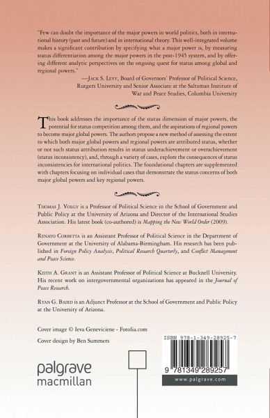 PART I: Major Global Powers and Their Status Major Power Status Attribution: Conceptual and Methodological Issues; T.J.Volgy , R.Corbetta , K.Grant , & R.Baird Global Leader, Global Power, Status Consistent Power: The United States; W.R.Thompson From Underachiever to Overachiever, and Where to Now: Russia as a Major Power; M.R.Freire From Regional Player to Overachieving Major Power: China; Y.Deng The Ups and Downs of Major Power Status: France; B.Badie PART II: Regional Powers, Status, and Aspirations for the Global Stage Regional Powers and Their Status: Further Conceptual and Methodological Issues; T.J.Volgy , R.Corbetta , K.Grant , & R.Baird South American Regional Order: the Growth of Brazil as a Regional Power; M.Herz Regional Power Development in a Space Thick with Competing Powers: India; R.Bashrur Regional Power Development in High Conflict Geopolitical Space: Iran and its Competitors Developing Regional Power Capacity: South Africa PART III: Conclusions: The Struggle for World Order and the Future of International Politics; T.J.Volgy, R.Corbetta, K.Grant , & R.Baird