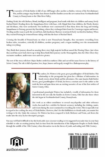 The narrative of Uriah Barber is full of one cliff hanger after another as Barber, veteran of the Revolutionary War, and his younger step-brother Isaac Bonser lead five families across the new nation from Northumberland County in Pennsylvania to the Ohio River Valley. Dashing Uriah, his wife Barbara, blond, intelligent and pregnant, head south with their six children and nanny, lovely Rachael Baird. Heading down the Susquehanna River with Isaac, wife Abigail their four children, the Wards, Beattys and McAdams, who were newlyweds. Two keelboats were constructed to float them down the long and twisting Susquehanna to Paxtang, present day Harrisburg, where they exchanged their boats for Conestoga wagons and horses. Needing another man to pole the second boat, dark handsome Shawnee scout Jacob Early was hired in Sunbury. When they reached Paxtang he returned home taking with him the heart of Rachael Baird. Crossing the breadth of Pennsylvania on what is now Pennsylvania Turnpike, they encounter everything from broken axles, tornadoes, critically ill children, another pregnancy and a wagon tumbling over the mountainside taking everything. They finish their journey aboard an amazing three-story high majestic keelboat named the Floating Palace. Just when they need him most Early shows up to help them finish their journey on the Monongahela, then the Ohio where they encounter sandbars, underwater trees and river pirates. The rest of the story tells how Major Barber settled in southern Ohio and carved his name forever in the history of Scioto County. The tale is full of passion, love, hope, humor and tragedy enough for a Shakespearean play.