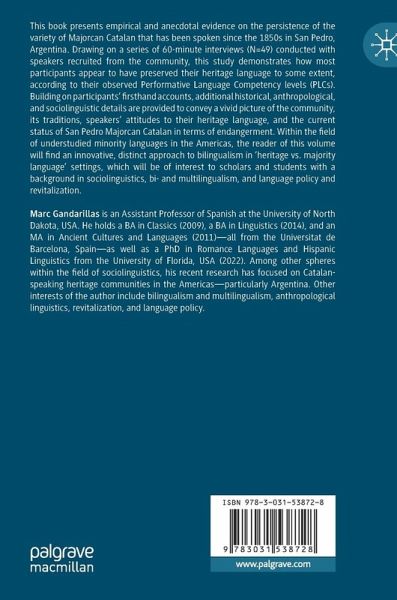 This book presents empirical and anecdotal evidence on the persistence of the variety of Majorcan Catalan that has been spoken since the 1850s in San Pedro, Argentina. Drawing on a series of 60-minute interviews (N=49) conducted with speakers recruited from the community, this study demonstrates how most participants appear to have preserved their heritage language to some extent, according to their observed Performative Language Competency levels (PLCs). Building on participants' firsthand accounts, additional historical, anthropological, and sociolinguistic details are provided to convey a vivid picture of the community, its traditions, speakers' attitudes to their heritage language, and the current status of San Pedro Majorcan Catalan in terms of endangerment. Within the field of understudied minority languages in the Americas, the reader of this volume will find an innovative, distinct approach to bilingualism in 'heritage vs. majority language' settings, which will beof interest to scholars and students with a background in sociolinguistics, bi- and multilingualism, and language policy and revitalization.