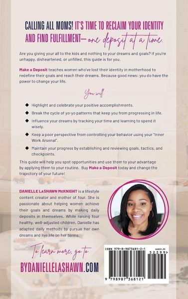 CALLING ALL MOMS! It's time to reclaim your identity and find fulfillment-one deposit at a time. Being a mother is A LOT... Everyone depends on you. Everyone wants your time and attention. But what about what you want and need? What about YOU? If you don't know what you want for yourself yet, that's okay. In fact, it's ideal! This is an opportunity to relearn yourself, redefine who you are, and LEAN IN to who you want to become. Lifestyle content creator and mom of four, Danielle LaShawn McKnight was there-a mom who loved her family endlessly but didn't recognize who she was outside of the "mom" title. From endless chores to always investing in family first, Danielle had to do something different or stay miserable. Make a Deposit is the step-by-step guide for women who've lost their identity in motherhood to redefine themselves using their current situation as a stepping stone. Packed with insights into how making small deposits daily can add up to drastic life improvements, this is the pathway that will help you create your best life centered on who you are now. With easy-to-use exercises, Make a Deposit teaches you to use daily choices, no matter how insignificant they seem, to increase your rewards. Discover how to:Celebrate yourself by recalling your positive attributes and accomplishments and how they've benefited your family. Identify any yo-yo experiences that are keeping you from making progress and create a strategy to break the cycle. Influence your dreams by tracking how you spend your time for a week. Keep your perspectives from controlling your behavior negatively, get to the root cause of your emotions, and correct them with easy tools like breath work, stretching, or writing. Things you think, say, and do have the power to change your life. Down-to-earth and humorous, this self-care guide will help you spot opportunities to change your future into one you love.