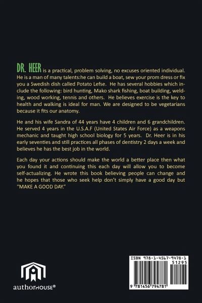 Dr. Heer is a practical, problem solving, no excuses oriented individual. He is a man of many talents: he can build a boat, sew your prom dress or fix you a Swedish dish called Potato Lefse. He has several hobbies which include the following: bird hunting, Mako shark fishing, boat building, welding, wood working, tennis and others. He believes exercise is the key to health and walking is ideal for man. We are designed to be vegetarians because it fits our anatomy. He and his wife Sandra of 44 years have 4 children and 6 grandchildren. He served 4 years in the U.S.A.F (United States Air Force) as a weapons mechanic and taught high school biology for 5 years. Dr. Heer is in his early seventies and still practices all phases of dentistry 2 days a week and believes he has the best job in the world. Each day your actions should make the world a better place then what you found it and continuing this each day will allow you to become self-actualizing. He wrote this book believing people can change and hope those who seek help don'ts simply have a good day but "MAKE A GOOD DAY."