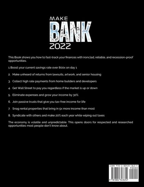 This Book shows you how to fast-track your finances with ironclad, reliable, and recession-proof opportunities.1. Boost your current savings rate over 800x on day 1 2. Make unheard of returns from lawsuits, artwork, and senior housing 3. Collect high rate payments from home builders and developers 4. Get Wall Street to pay you regardless if the market is up or down 5. Eliminate expenses and grow your income by 30% 6. Join passive trusts that give you tax-free income for life 7. Snag rental properties that bring in 5x more income than most 8. Syndicate with others and make 20% each year while wiping out taxes The economy is volatile and unpredictable. This opens doors for respected and researched opportunities most people don't know about.