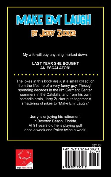 My wife will buy anything marked down. LAST YEAR SHE BOUGHT AN ESCALATOR! The jokes in this book are just a small collection from the lifetime of a very funny guy. Through spending decades in the NY Garment Center, summers in the Catskills, and from his own comedic brain, Jerry Zucker puts together a smattering of jokes to "Make Em' Laugh." Jerry is enjoying his retirement in Boynton Beach, Florida. At 91 years old he is playing golf once a week and Poker twice a week!