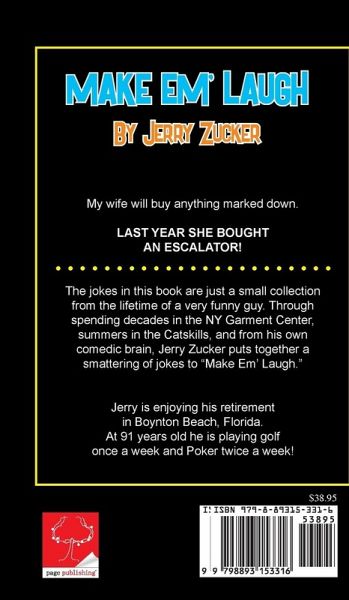 My wife will buy anything marked down. LAST YEAR SHE BOUGHT AN ESCALATOR! The jokes in this book are just a small collection from the lifetime of a very funny guy. Through spending decades in the NY Garment Center, summers in the Catskills, and from his own comedic brain, Jerry Zucker puts together a smattering of jokes to "Make Em' Laugh." Jerry is enjoying his retirement in Boynton Beach, Florida. At 91 years old he is playing golf once a week and Poker twice a week!