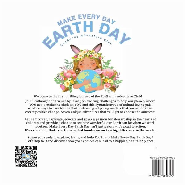 Embark on a heartwarming Earth Day journey with EcoBunny Adventure Club, where every day is an opportunity to brighten the world! This interactive book, packed with engaging rhymes, vivid illustrations, and fascinating facts, educates and ignites a passion for stewardship in young hearts. Designed to inspire both young readers and their caregivers, this captivating book interweaves tales of protecting our planet and caring for all its inhabitants into a hopeful and action-packed adventure. Join EcoBunny and a cheerful cast of friends as they embrace eco-challenges with creativity, teamwork, and boundless enthusiasm. Ideal for both home and classroom, it's a dynamic addition to any young reader's collection, especially for those passionate about making a positive change. And in the spirit of saving trees, all are welcome to request your copy at your local library. EcoBunny's Earth Day Adventure is more than just a story - it's a call to action, reminding us that even the smallest hands can have a significant impact on the world. So, are you ready to explore, learn and assist EcoBunny in Making Every Day Earth Day? Let's hop into action and see how your choices can contribute to a happier, healthier planet! Key Features: * Interactive Storytelling: Children control the story by making choices for EcoBunny and friends, navigating through seven distinct adventures that highlight caring for our planet. * Learning Made Exciting Engaging rhymes, vivid illustrations, and interesting facts about the Earth enrich each adventure, making the learning experience enjoyable and impactful. * Empowers Young Minds: This book encourages kids to make decisions - or in classroom environment to vote - teaching them that their actions can positively influence the environment. * Varied Environmental Themes: Tackling a myriad of topics, EcoBunny faces challenges that encourages readers to think about their everyday impact on the planet. * Exciting Exploration: Multiple story paths ensure the book can be read over and over, offering new lessons and outcomes with each journey. * Teamwork in Action: Alongside a diverse group of animal friends, EcoBunny shows the strength of collaborating towards a shared goal, inspiring readers to work together in their environmental interests. * Meet Endangered Species: Through the adventures of EcoBunny Adventure Club, young readers are introduced to animals on the endangered species list, sparking interest in wildlife conservation. This topic is presented in a way that is easily digestible for young readers, and older readers are encouraged to further explore this sensitive topic. * Interactive QR Code: On the back of the book, a QR code leads to a dedicated landing page with in-depth information about the endangered species featured in each story, making learning interactive and fun. * Charity: Each month, a percentage of the book's proceeds will be donated, teaching children about the power of giving back and supporting conservation efforts. * Enriching Reading Experience: Foster a deep, lasting love for nature, animals and an understanding of the importance of protecting endangered species and our Earth for future generations.