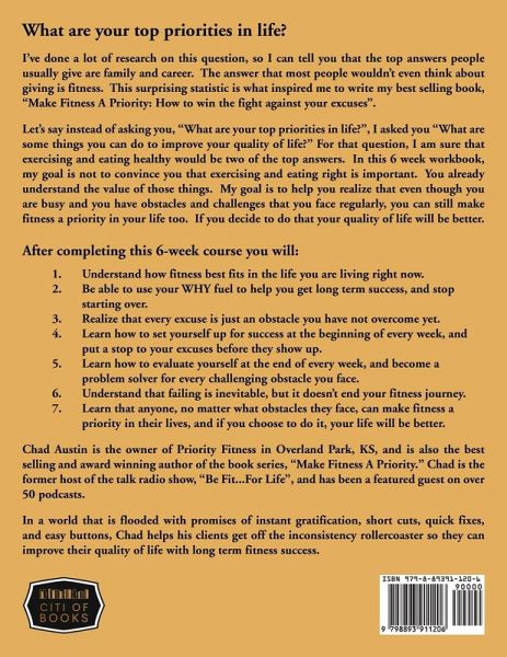 What are your top priorities in life? I've done a lot of research on this question, so I can tell you that the top answers people usually give are family and career. The answer that most people wouldn't even think about giving is fitness. This surprising statistic is what inspired me to write my best selling book, "Make Fitness A Priority: How to win the fight against your excuses". Let's say instead of asking you, "What are your top priorities in life?", I asked you "What are some things you can do to improve your quality of life?" For that question, I am sure that exercising and eating healthy would be two of the top answers. In this 6 week workbook, my goal is not to convince you that exercising and eating right is important. You already understand the value of those things. My goal is to help you realize that even though you are busy and you have obstacles and challenges that you face regularly, you can still make fitness a priority in your life too. If you decide to do that your quality of life will be better. After completing this 6-week course you will: 1. Understand how fitness best fits in the life you are living right now. 2. Be able to use your WHY fuel to help you get long term success, and stop starting over. 3. Realize that every excuse is just an obstacle you have not overcome yet. 4. Learn how to set yourself up for success at the beginning of every week, and put a stop to your excuses before they show up. 5. Learn how to evaluate yourself at the end of every week, and become a problem solver for every challenging obstacle you face. 6. Understand that failing is inevitable, but it doesn't end your fitness journey. 7. Learn that anyone, no matter what obstacles they face, can make fitness a priority in their lives, and if you choose to do it, your life will be better.