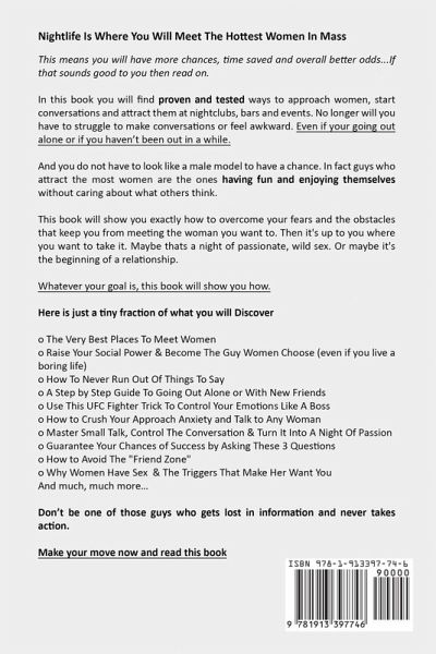 How To Approach and Attract Women In Everyday Situations Have you ever seen a beautiful woman sitting in a café by herself, thought she was incredibly attractive, walked out and spent the rest of the day kicking yourself for not talking to her? Don't regret the conversations you aren't having with women anymore. If you're looking for an alternative to bars and clubs, or if you're a little older and don't have time for the late nights anymore, day game is for you! And if you want to learn how to pick up girls, get a girlfriend, and gain confidence then you've come to the right place. Imagine being able to approach any woman in any situation. You see the hottest and best women aren't going to be at a nightclub. You’re going to see her at the grocery store or at the local gas station picking up a coffee. Only a handful of men approach women during the day. This gives you a Huge advantage to meeting and dating the most beautiful and amazing women. In this book is real, tried and tested material on how to meet and date women you meet in daily life without coming across as creepy. Here’s just a tiny fraction of what you’ll discover: A simple system for meeting women and getting a date - page 5 Where to easily meet women in your city - page 17 Why most guys get rejected and how to avoid it - page 44 How to overcome your fears and approach with confidence - page 31 What to say to start conversations in different environments (e.g. in a coffee shop, shopping mall, on the street, etc) - page 18 And how to have a conversation that she'll find interesting - page 33 What makes women attracted and how to create an irresistible first impression in minutes - page 25 Powerful mindsets so your masculinity and confidence shine through - page 9 From hello to the bedroom in minutes! - page 42 Turn your numbers into romantic and passionate dates - page 47 And much, much more.. Take a second to imagine the next time a beautiful woman walks past you, but this time you talk to her and things go well. A lot of men don't realize that most women don't dream about meeting a guy in a nightclub. Which means good guys like you have an easy way to approach and talk to women without coming across as creepy. Find out everything you need to know in this book, simply Buy This Book