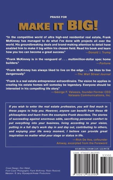 PRAISE FOR MAKE IT BIG! "In the competitive world of ultra high-end residential real estate, Frank McKinney has managed to do what I've done with projects all over the world. His groundbreaking deals and brand-making attention to detail have enabled him to make it big within his chosen field. Read his book and learn how you too can become a great success." -- Donald J. Trump "Frank McKinney is in the vanguard of . . . multimillion-dollar spec home builders." -- Fortune "Frank McKinney has always liked to live on the edge ...he likes to live dangerously." -- The Wall Street Journal "Frank is a real estate entrepreneur extraordinaire. The vision he applies in creating his estate homes will someday be legendary. Everyone should be interested in his compelling life story." -- George F. Valassis, founder/former CEO Valassis Communications, Inc. If you wish to enter the real estate profession, you will find much in these pages to help you. However, anyone can benefit from these 49 philosophies and learn from the examples Frank describes. The stories of succeeding against enormous odds, sacrificing personal comfort to put everything into your business, living according to your vision, putting in a full day's work day in and day out, contributing to others, and enjoying your life every moment, I believe can provide great inspiration no matter what your stage or status in life. -- Rich De Vos, cofounder Amway, excerpted from the Foreword