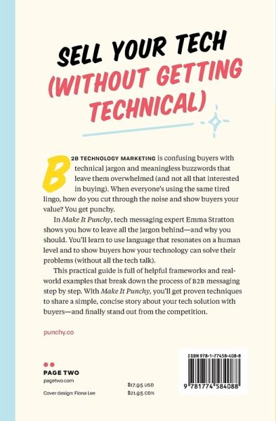 Sell your tech (without getting technical). B2B tech marketing is confusing buyers with technical jargon and drowning them in meaningless buzzwords that leave them overwhelmed (and not all that interested in buying). When everyone's using the same tired lingo, how do you cut through the noise and show buyers your value? You get punchy. In Make It Punchy, tech messaging expert Emma Stratton shows you how and why you need to leave all the jargon behind. How to get real with buyers about why your technology matters to them. How to use language that resonates on a human level. And how to move away from how the tech works and shift buyers' minds to how it can solve their problems. This practical guide is full of helpful frameworks and real-world examples that break down the process of B2B messaging step by step-from the first strategy session to writing to implementation. Emma leads you through exercises that help you understand your customers, engage your creativity, and get your team involved. She shows you how to break down your messaging into a clear, concise format that works for everything from a single product launch to a large-scale initiative. With Make It Punchy, you'll get proven techniques to share a simple, concise story about your tech solution with buyers-and finally stand out from the competition.