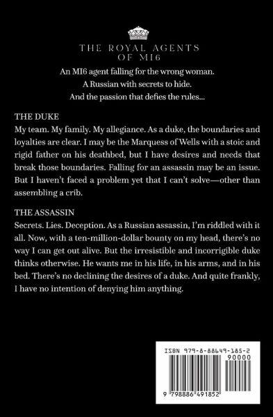 What is sexier than a billionaire English-accented spy?Put him in a tuxedo and make him a duke. An M16 agent falling for the wrong woman.A Russian with secrets to hide.And the passion that defies the rules... THE DUKE My team. My family. My allegiance. As a duke, the boundaries and loyalties are clear. I may be the Marquess of Wells with a stoic and rigid father on his deathbed, but I have desires and needs that break those boundaries. Falling for an assassin may be an issue. But I haven't faced a problem yet that I can't solve-other than assembling a crib. THE ASSASSIN Secrets. Lies. Deception. As a Russian assassin, I'm riddled with it all. Now, with a ten-million-dollar bounty on my head, there's no way I can get out alive. But the irresistible and incorrigible duke thinks otherwise. He wants me in his life, in his arms, and in his bed. There's no declining the desires of a duke. And quite frankly, I have no intention of denying him anything.