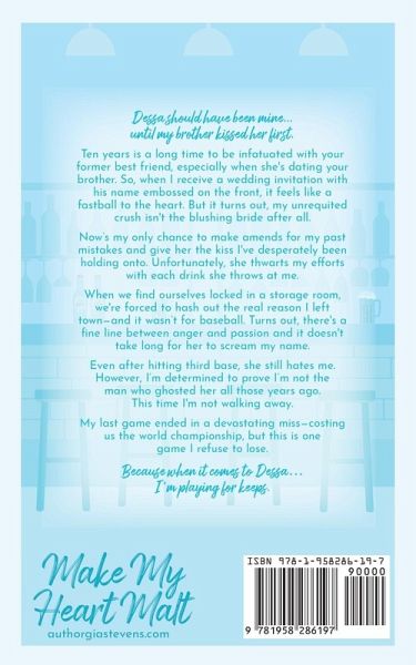 Dessa should have been mine... until my brother kissed her first. Ten years is a long time to be infatuated with your former best friend, especially when she's dating your brother. So, when I receive a wedding invitation with his name embossed on the front, it feels like a fastball to the heart. But it turns out, my unrequited crush isn't the blushing bride after all. Now's my only chance to make amends for my past mistakes and give her the kiss I've desperately been holding onto. Unfortunately, she thwarts my efforts with each drink she throws at me. When we find ourselves locked in a storage room, we're forced to hash out the real reason I left town-and it wasn't for baseball. Turns out, there's a fine line between anger and passion and it doesn't take long for her to scream my name. Even after hitting third base, she still hates me. However, I'm determined to prove I'm not the man who ghosted her all those years ago. This time I'm not walking away. My last game ended in a devastating miss-costing us the world championship, but this is one game I refuse to lose. Because when it comes to Dessa... I'm playing for keeps.