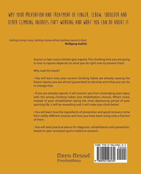 As Wolfgang Gullich said, "getting strong is easy, getting strong without getting injured is hard". Sooner or later, nearly all climbers get injured and it will be injuries that ultimately dictate how far you get in climbing, if you let them. Unfortunately, the data shows it takes over a decade just to get small proportions of medical research adopted in regular practice. Sourcing reliable and up to date advice on preventing and treating finger, elbow, shoulder and other climbing injuries is challenging to say the least. You need to be the expert, because there are so many strands of knowledge and practice to pull together to stay healthy as a climber, and no single source of advice to cover all of these. The book draws together both the cutting edge of peer reviewed sports medicine research, and the subtle concepts of changing your climbing habits and routine to prevent and successfully recover from injuries. It is a handbook on how to take care of yourself as a lifelong climbing athlete. By spanning the fields of climbing coaching, physiotherapy, sports medicine and behavioural science, it goes beyond the general advice on treating symptoms offered by sports medicine textbooks and into much more detail on technique and habits specific to climbing than the existing climbing literature base. You will learn how your current climbing habits are already causing your future injuries and what you can do to change that. If you are already injured, it will prevent you from prolonging your injury with the wrong climbing habits and rehabilitation choices. You will learn how the ingredients of prevention and good recovery come from wildly different sources and how you have been using only a fraction of them. Fully referenced throughout, the practical advice for diagnosis, rehabilitation and prevention of climbing injuries is drawn from up to date peer reviewed sports medicine research.
