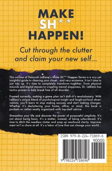 This volume of Deborah LeBlanc's Make Sh** Happen Series is a wry yet insightful guide to cleaning your closet . . .and very existence. It isn't time to just tidy up. It's time to completely transform-together. From physical mounds and digital masses to crippling mental sloppiness, Deborah has tactics proven to help break free of all disorder. Framed correctly, making a game plan isn't dull-it's revolutionary. With LeBlanc's unique blend of psychological insight and laugh-out-loud observations, you'll learn to stop making excuses and start making changes. Whether if's decluttering your home, office, or mind, this book is packed-or rather neatly organized-with top-shelf advice. Streamline your life and discover the power of purposeful simplicity. It's not about being basic. It's a matter, instead, of being unburdened. It's time to ditch the needless clutter and snap up newfound clarity. Improvement isn't a chore at all. It's a labor of love that can change your world . . .