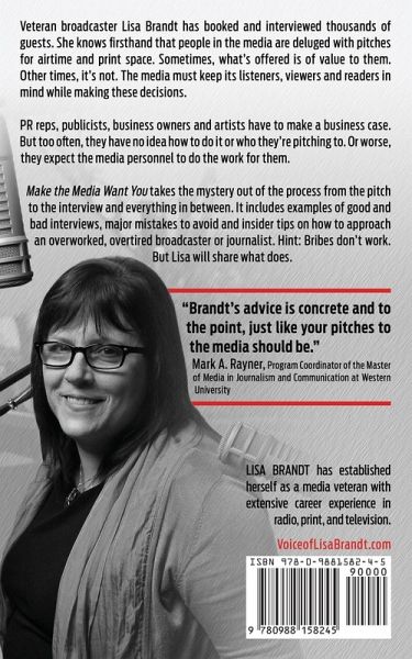 Veteran broadcaster Lisa Brandt has booked and interviewed thousands of guests. She knows firsthand that people in the media are deluged with pitches for airtime and print space. Sometimes, what’s offered is of value to them. Other times, it’s not. The media must keep its listeners, viewers and readers in mind while making these decisions. PR reps, publicists, business owners and artists have to make a business case. But too often, they have no idea how to do it or who they’re pitching to. Or worse, they expect the media personnel to do the work for them. Make the Media Want You takes the mystery out of the process from the pitch to the interview and everything in between. It includes examples of good and bad interviews, major mistakes to avoid and insider tips on how to approach an overworked, overtired broadcaster or journalist. Hint: Bribes don’t work. But Lisa will share what does.
