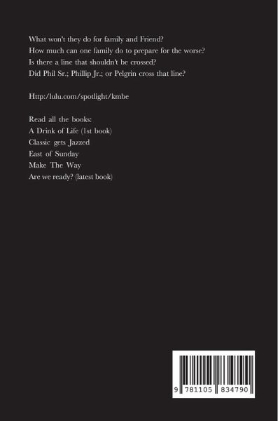 What won't they do for family and Friend? How much can one family do to prepare for the worse? Is there a line that shouldn't be crossed? Did Phil Sr.; Phillip Jr.; or Pelgrin cross that line? Http:/lulu.com/spotlight/kmbe Read all the books: A Drink of Life (1st book) Classic gets Jazzed East of Sunday Make The Way Are we ready? (latest book)