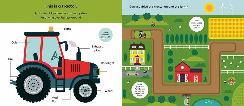 Drive five vehicles around the tracks! Discover things that go in this chunky new Make Tracks board book, and trace each vehicle's path around the farm. In this interactive series with easy to use, durable sliders, your toddler can operate a tractor, a combine harvester, a cattle truck, and an ATV! Perfect for helping toddlers develop hand eye coordination, while also encouraging interaction with simple farm-themed first words, clear diagrams, and helpful text prompts to learn through play. The perfect book for children who love tractors-and being in the driver's seat! Other titles in the series include: ·Make Tracks: Cars ·Make Tracks: Trains ·Make Tracks: Trucks ·And more!