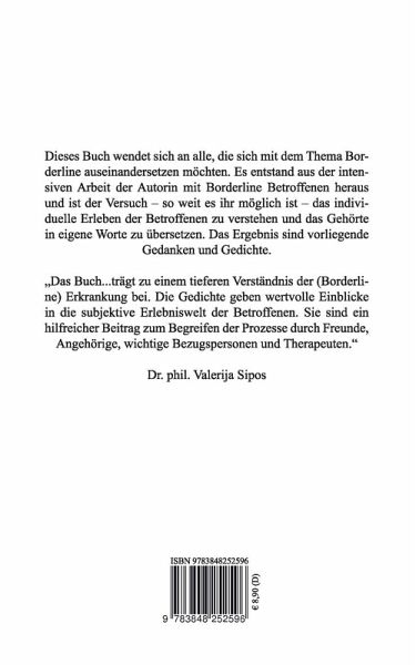 Dieses Buch wendet sich an alle, die sich mit dem Thema Borderline auseinandersetzen möchten. Es entstand aus der intensiven Arbeit der Autorin mit Borderline-Betroffenen heraus und ist der Versuch - so weit es ihr möglich ist - das individuelle Erleben der Betroffenen zu verstehen und das Gehörte in eigene Worte zu übersetzen. Das Ergebnis sind vorliegende Gedanken und Gedichte. "Das Buch...trägt zu einem tieferen Verständnis der (Borderline) Erkrankung bei. Die Gedichte geben wertvollle Einblicke in die subjektive Erlebniswelt der Betroffenen. Sie sind ein hilfreicher Beitrag zum Begreifen der Prozesse durch Freunde, Angehörige, wichtige Bezugspersonen und Therapeuten." Dr. phil. Valerija Sipos