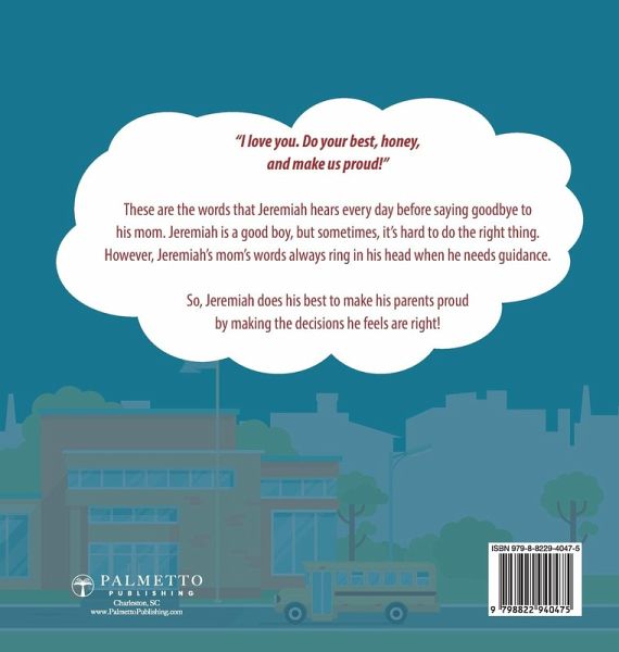 When the kids in Jeremiah's class pressure him to make bad choices in school, he's tempted to do so to fit in. However, he remembers his mother's words, which help him choose what's right. "I love you. Do your best, honey, and make us proud!" These are the words that Jeremiah hears every day before saying goodbye to his mom from the drop-off line and walking into school. Jeremiah is a good boy, but sometimes, it's hard to do the right thing. Especially when his friends want to run in the halls (which looks like a lot of fun!) or when it's really hard to remember the right answer on a test, and…mehr
