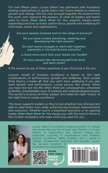 For over fifteen years, Louise Gilbert has partnered with Australia's leading organisations to guide teams and inspire leaders to embrace growth and change. She has now brought together the lessons from this work, and captured the essence of what all leaders and teams want to know. Make Work Work for You unpacks twenty-seven leadership practices to foster performance, growth and wellbeing for individuals, teams and organisations.Are your people stressed and on the verge of burnout? Do you have trouble attracting, retaining and developing the right people? Do your teams struggle to work well together, especially in the hybrid work scenario? Is there more work than your teams can handle? Do your people feel disconnected from work and each other? If the answer to any of these questions is yes, this book is for you. Louise's model of business excellence is based on the right combinations of performance, growth and wellbeing. Most people think there's a trade-off, that you can't have wellbeing if you also want growth and performance. Louise proves this wrong. When you have two but not the other, there are consequences: unrealised potential, unsustainable ways of working and underdeveloped people. The secret is to press all three 'pedals' and make the right 'moves' at the right time to create excellence. This book supports leaders so they're less smashed, less stressed and able to lead better lives while achieving big business improvements and outcomes. Whether you're a seasoned executive or an aspiring leader, Make Work Work for You equips you with the tools to thrive in the modern workplace and make work truly work for you.