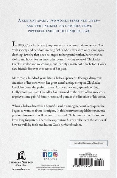 One broken woman. One lost man. And the long-buried secrets tying them together. After escaping an abusive relationship, Chelsea Spencer flees to Chickadee Creek--the town where her great aunt Rosemary owns a quaint little antique shop. There, Chelsea plans to help with the shop as her aunt heals from an accident--and perhaps find some healing of her own. Liam Chandler was one film away from a leading role when his brother Jacob was stricken with cancer. After spending the last months of Jacob's life with him in Boise, Liam heads to the vacation home he built outside of Chickadee Creek to get his life and his faith back on track. While working to clean out a storage room in the antique shop, Chelsea finds an old violin. Aunt Rosemary says she may have the instrument, but they soon learn it is very valuable and once belonged to Cora Chandler, Liam's great-great-grandmother. Drawn together by the old violin and stories from the past, Chelsea and Liam begin to find answers for their present and the future God has in store for them. * Full-length split-time romance novel * Includes discussion questions for book clubs * Also by Robin Lee Hatcher: How Sweet It Is, Cross My Heart, and Who I Am With You