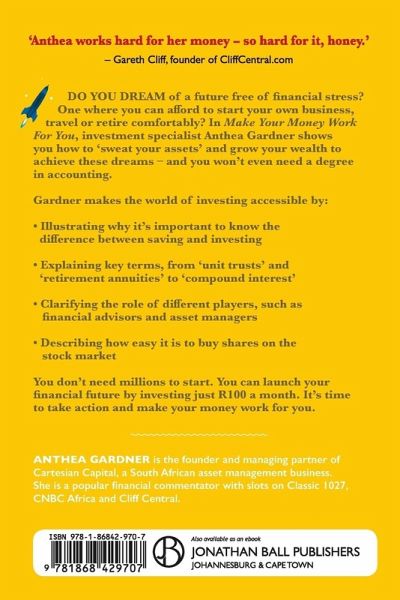 DO YOU DREAM of a future free of financial stress? One where you can afford to start your own business, travel or retire comfortably? In Make Your Money Work For You, investment specialist Anthea Gardner shows you how to 'sweat your assets' and grow your wealth to achieve these dreams - and you won't even need a degree in accounting. Gardner makes the world of investing accessible by: Illustrating why it's important to know the difference between saving and investing Explaining key terms, from 'unit trusts' and 'retirement annuities' to 'compound interest' Clarifying the role of different players, such as financial advisors and asset managers Describing how easy it is to buy shares on the stock market You don't need millions to start. You can launch your financial future by investing just R100 a month. It's time to take action and make your money work for you.